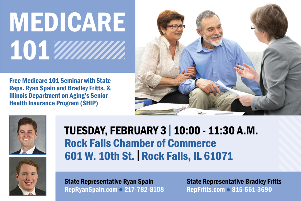 I invite all local seniors who have questions about Medicare to attend a FREE Medicare 101 seminar TOMORROW from 10:00 AM to 11:30 AM at the Rock Falls Chamber of Commerce, located at 601 W 10th Street in Rock Falls. My office is excited to co-host this event, alongside State Representative Ryan Spain, to remain proactive in assisting our senior population by ensuring they are able to fully utilize their Medicare benefits.